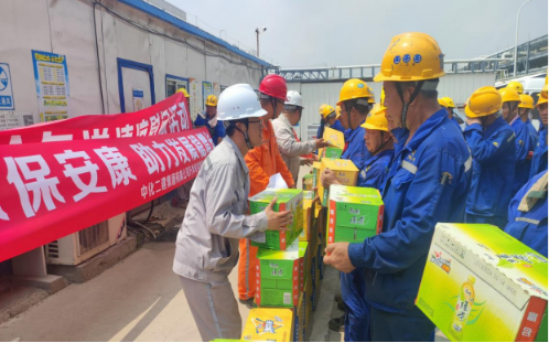 现场设立多个“清凉驿站”,每日供应绿豆汤、酸梅汤等解暑饮品,冰淇淋、电解质水随时补足;急救箱内藿香正气水、仁丹等防暑药品配备齐全,专人负责更新维护。同时,管理人员深入一线巡查督导,核查防护措施落实情况,工友们也自觉规范佩戴防护用品,形成全方位的安全保障体系。